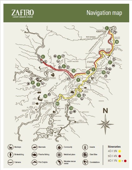 The itineraries are subject to change due to weather conditions at certain times of the year. The water levels of the rivers also vary from time to time, as well as the hours of sailing. Excursions may be modified at the discretion of the Zafiro crew.